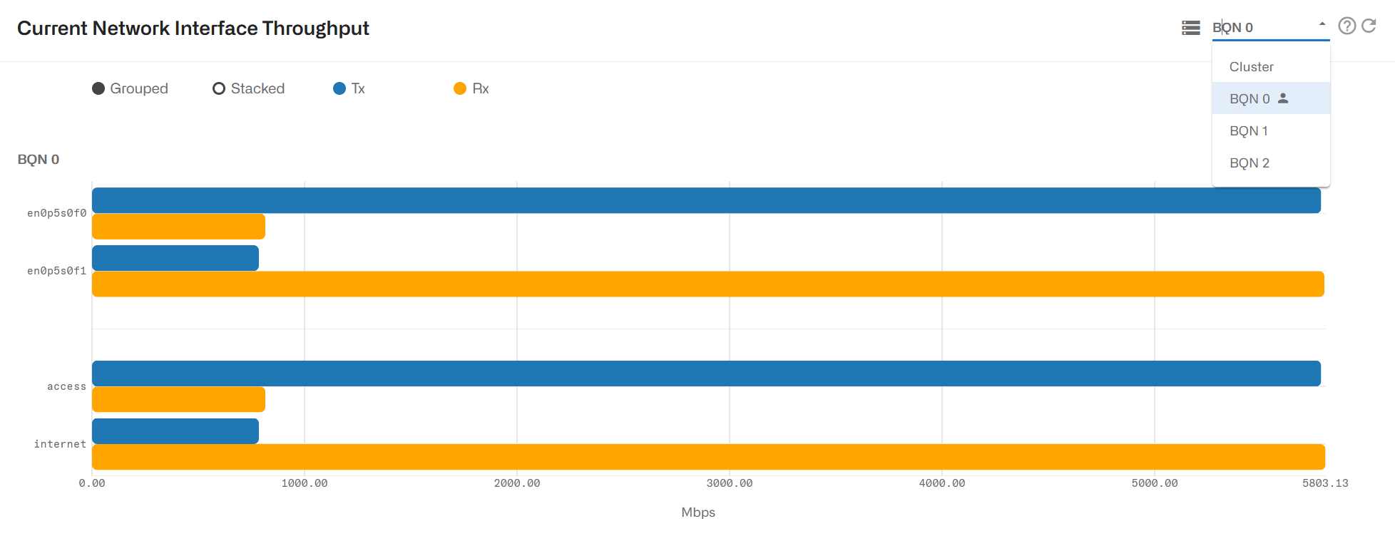 The pages can show not only information of the local server, but of any server of the cluster. For example, in Status->Interfaces->Throughput, a selector in the upper right can show throughput of a specific BQN Id or for all servers in the cluster (the icon next to BQN 0 indicates that we are logged in BQN 0):