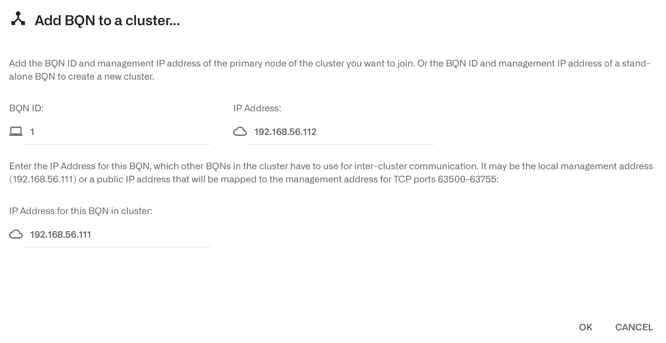 In the dialogue, enter the secondary BQN ID (1) and its BQN management IP address. In IP Address for this BQN in cluster, enter the primary address.