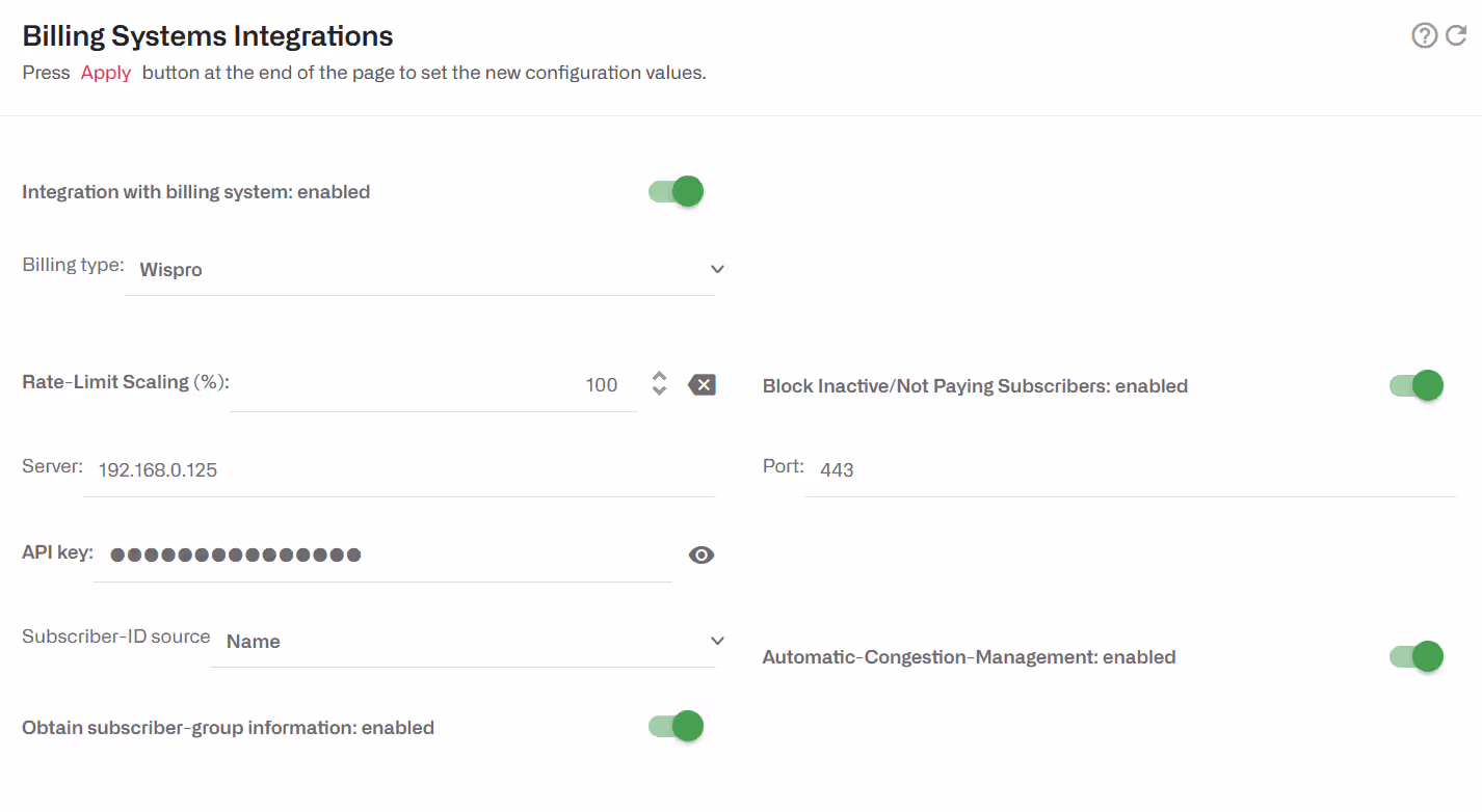 To activate Visp, go to Configuration->RADIUS/REST/Billing->Billing Systems, select Wispro and enable the switch.
