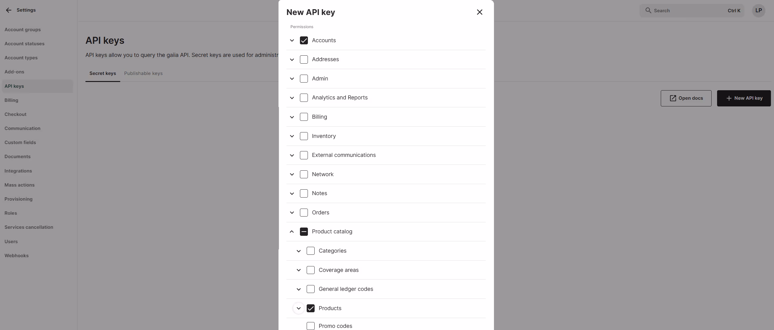 A REST API key will be needed in Gaiia. In Gaiia, go to Settings->API keys, click New Api key and select permits for Accounts and Product access.