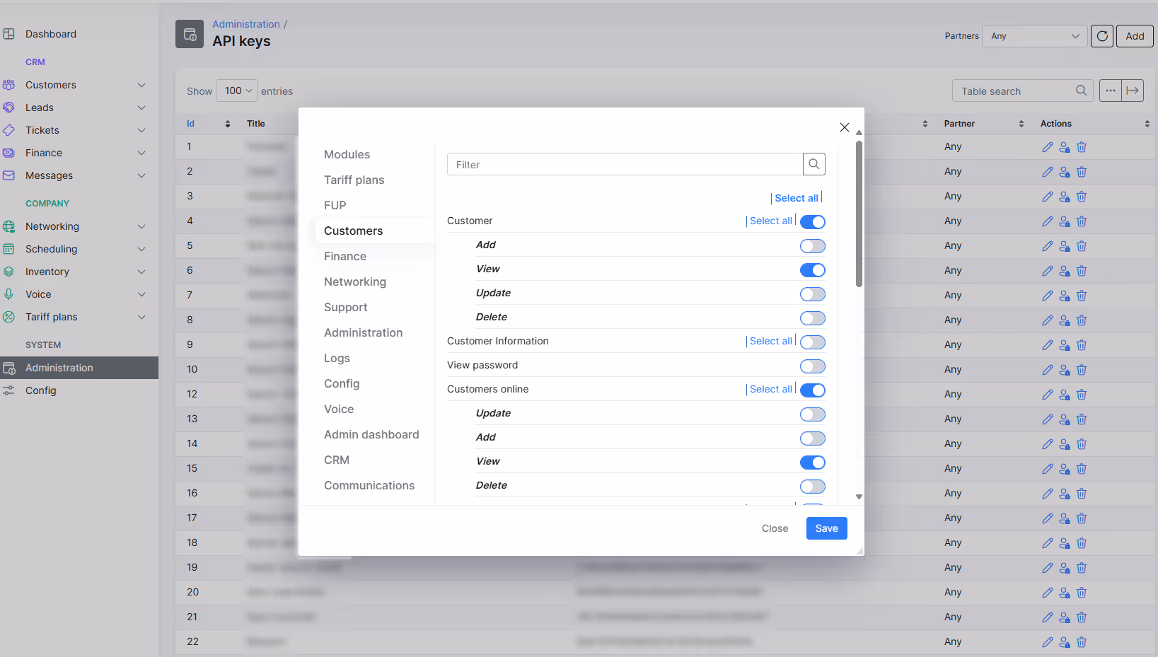 An API key and secret will be needed. They must be created in the Splynx system with the following settings: