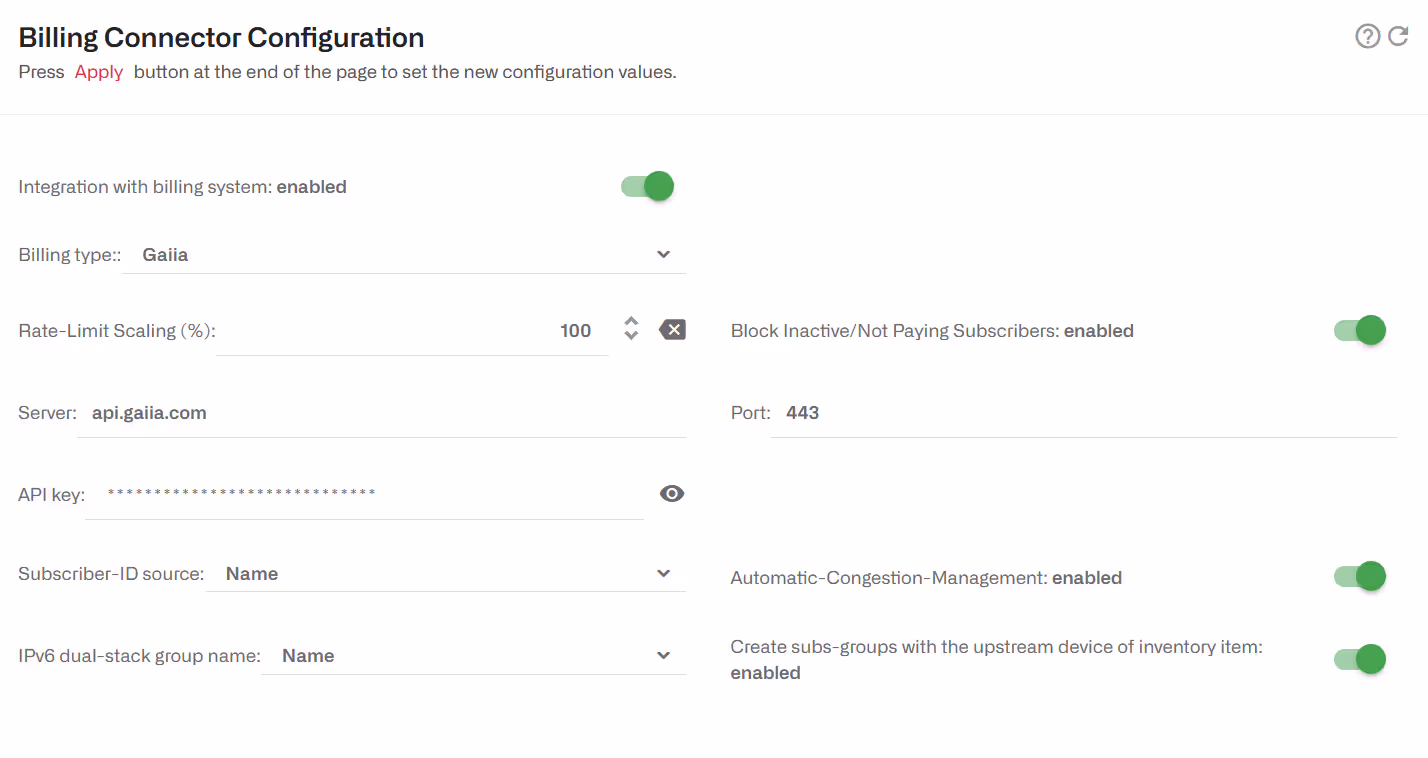 To activate Gaiia, go to Configuration->RADIUS/REST/Billing->Billing Systems, select Gaiia and enable the switch.