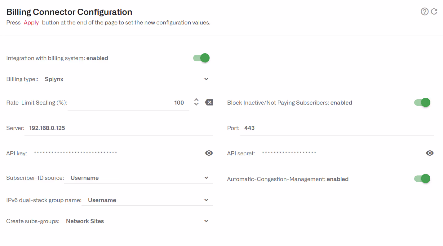 To activate Splynx in the BQN GUI, go to Configuration->RADIUS/REST/Billing->Billing Systems, select Splynx and enable the switch.