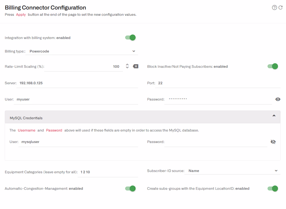 To activate Powercode in the BQN GUI, go to Configuration->RADIUS/REST/Billing->Billing Systems, select Powercode and enable the switch.