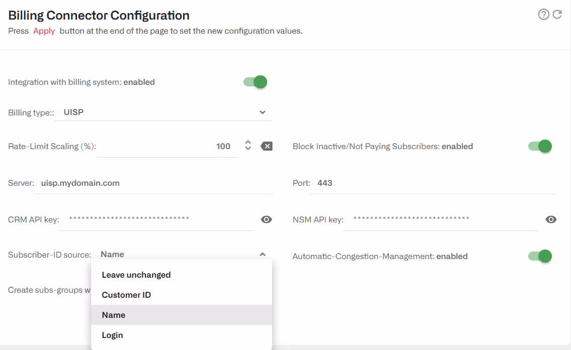 To activate UISP, go to Configuration->RADIUS/REST/Billing->Billing Systems, select UISP and enable the switch.