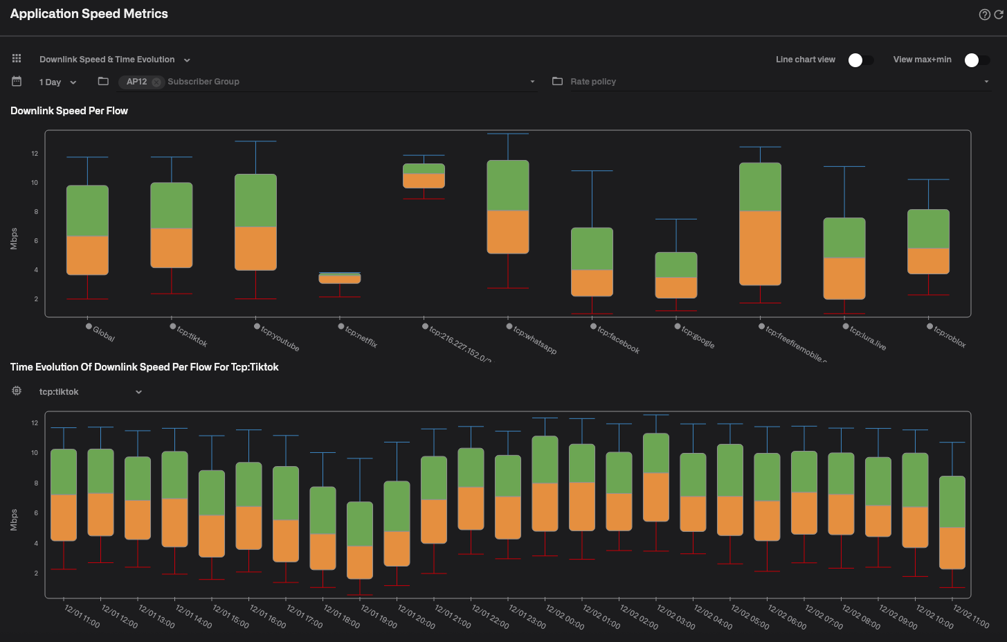 - Per-application speed metrics (examples: Netflix, Apple, Xbox, etc). The metrics scope can be the whole network, a subscriber, a rate-plan or specific subscriber-groups (including Access Points or OLT ports). In addition to the speed distribution, its evolution over time is also included.